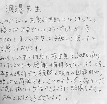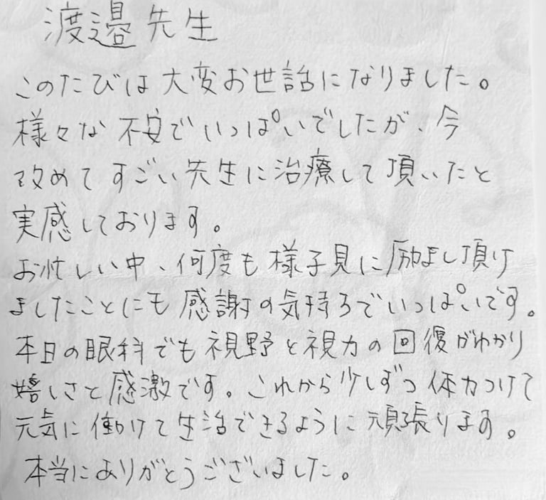 お忙しい中、何度も様子見に励まして頂いたことにも、感謝の気持ちでいっぱいです。本日の眼科でも視野と視力の回復がわかり、嬉しさと感激です。これから少しずつ体力つけて元気に働けて生活できるように頑張ります。
