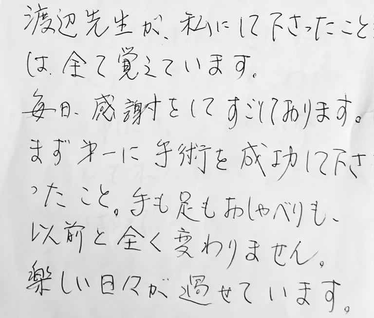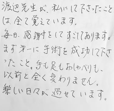 毎日、感謝をして過ごしております。まず第一に手術を成功して下さったこと。手も足もおしゃべりも、以前と全く変わりません。