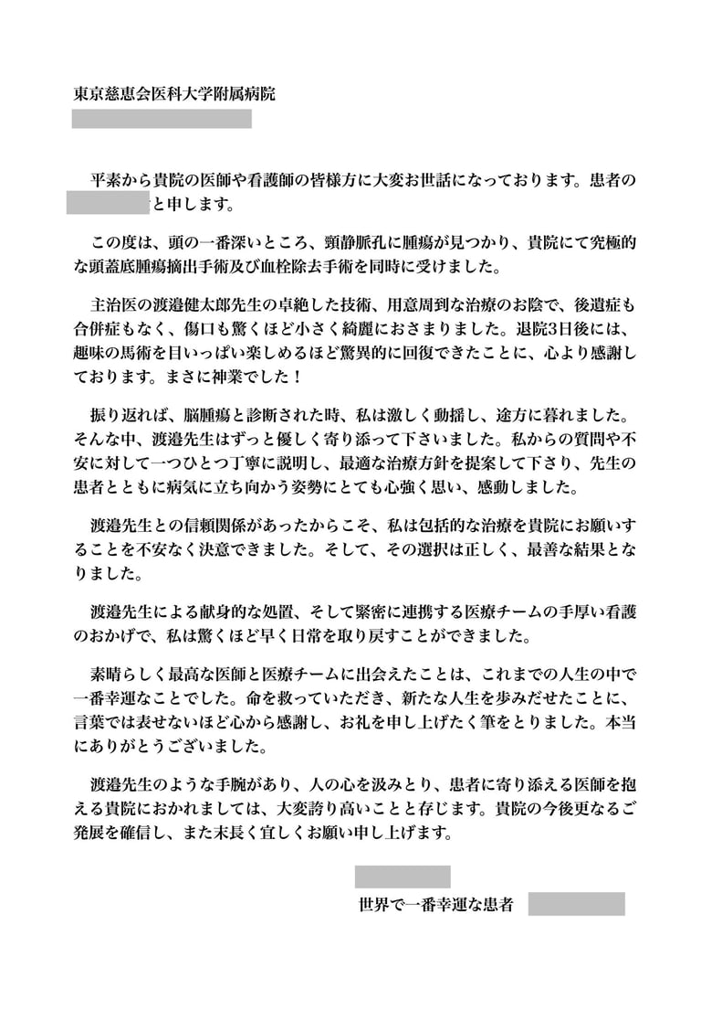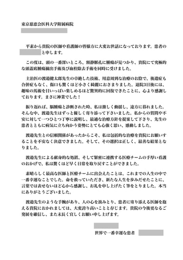 素晴らしく最高な医師と医療チームに出会えたことは、これまでの人生の中で一番幸運なことでした。命を救っていただき、新たな人生を歩みだせたことに、言葉では表せないほど心から感謝し、お礼を申し上げたく筆をとりました。本当にありがとうございました。