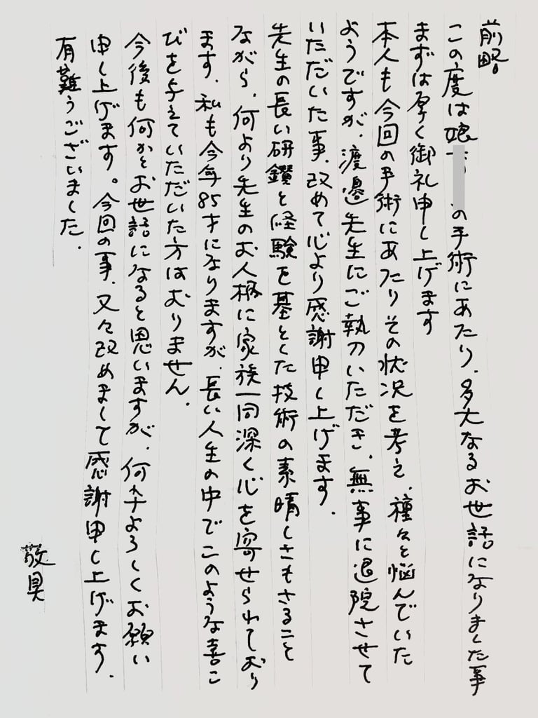 本人も今回の手術にあたりその状況を考え、種々と悩んでいたようですが、渡邉先生にご執刀いただき、無事に退院させていただいた事、改めて心より感謝申し上げます。